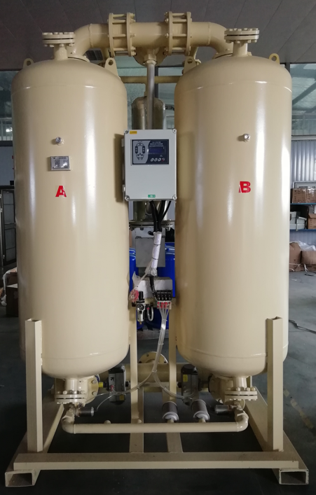 由空壓機排出的大量空氣,由壓縮空氣入口管流入,通過氣閥進入兩個塔中的運轉塔,其中的濕氣會被吸附劑所吸收而干燥。當空氣流通到塔頂時,空氣中的水份被全部吸收,露點溫度可達-40℃,從而達到干燥目的。整個循環標準需10分鐘,每塔各運行5分鐘,一塔在工作的過程中(運轉塔),另一塔處于再生狀態(非運轉塔)再生時間為4.5分鐘,在再生的過程中,運轉塔中一部份干燥的空氣經再生風量調節閥進入非運轉塔將塔內的水份經消音器帶到大氣中去。其運轉時耗氣量為設備處理量的12%