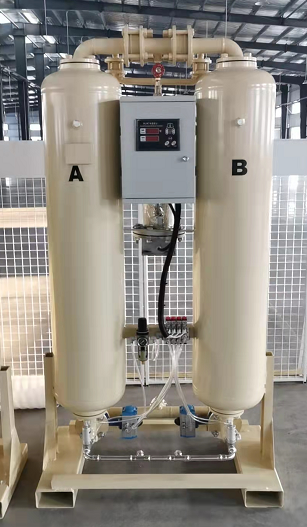 微熱吸干機(jī)綜合變壓吸附和變溫吸附之優(yōu)點(diǎn),在常溫高蒸汽分壓下吸附(工作);在較高溫度,低蒸汽分壓下解析(生),即吸附劑在吸附過(guò)程中吸附的水份,在再生過(guò)程依靠高品質(zhì)再生產(chǎn)(干燥空氣加熱)的熱擴(kuò)散和低分壓兩種機(jī)理的共同作用而得以清除。吸附濕空氣從下管系經(jīng)A1閥進(jìn)入A干燥罐體,自下向上 流過(guò)吸附劑床,干燥后的空氣從上管系排出。再生/吹冷 少量干燥空氣(約7%)通過(guò)上管系再生氣調(diào)節(jié)閥減壓后進(jìn)入加熱器加熱,這部分熱空氣(稱(chēng)為再生氣)進(jìn)入B干燥罐。對(duì)B罐體內(nèi)的吸附劑解析再生,恢復(fù)吸附劑的干燥能力,再生氣通過(guò)下管系B2閥排放到大氣中。均壓吸附劑再生結(jié)束后,B2閥關(guān)閉,B干燥罐逐漸升壓至在線工作壓力,準(zhǔn)備切換。切換下管系B1閥打開(kāi),A1閥關(guān)閉,A2閥打開(kāi),A、B兩干燥罐完成切換,B罐進(jìn)入吸附,A罐卸壓再生。工作順序、工作時(shí)間及加熱溫度由控制器自動(dòng)控制完成。